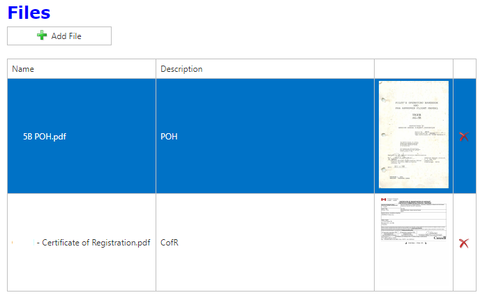 Upload and manage any files or documents realted to the aircraft, like a copy of the POH, maintenaece reports, check lists, or any other document.
